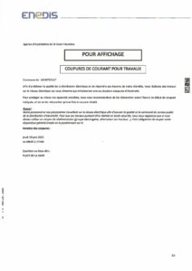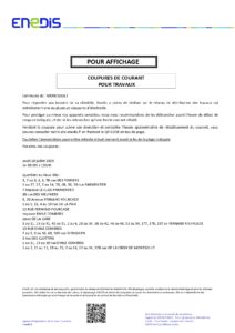 Afin d’améliorer la qualité de la distribution électrique et de répondre aux besoins de sa clientèle, Enedis va réaliser des travaux sur le réseau électrique. Ces travaux entraîneront une ou plusieurs coupures d’électricité.