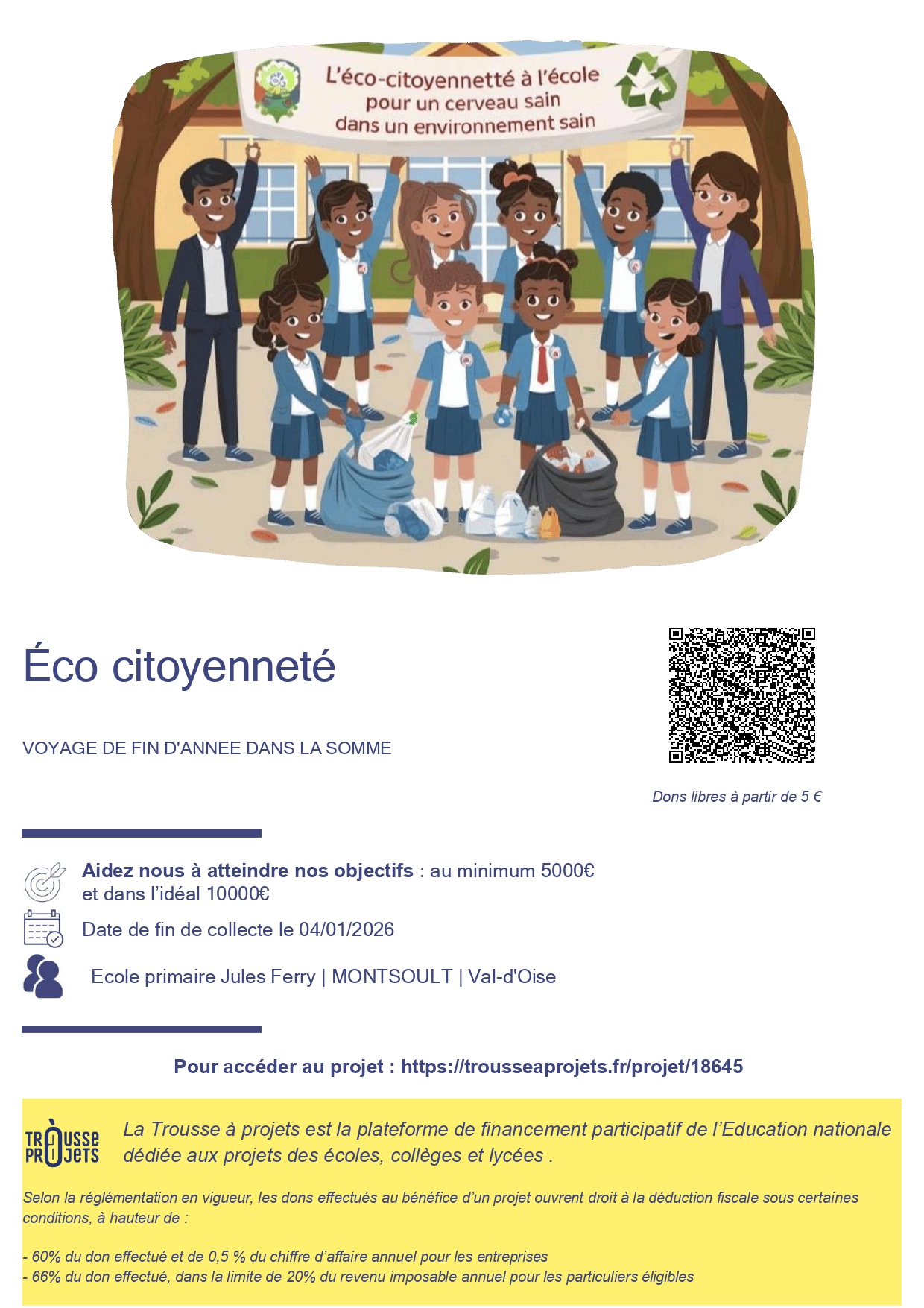 Cette année, les élèves de l’école primaire Jules Ferry de Montsoult s’investissent dans un projet riche de sens autour de l’éco-citoyenneté. Sensibilisation au respect de l’environnement, actions concrètes de nettoyage, apprentissage de gestes responsables… autant d’expériences qui nourrissent leur engagement au quotidien.