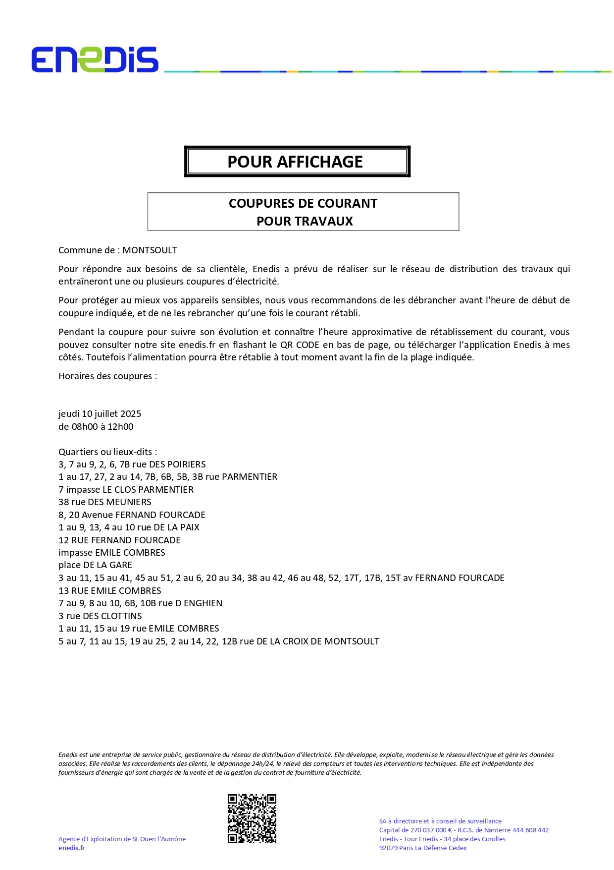 Pendant la coupure pour suivre son évolution et connaître l’heure approximative de rétablissement du courant, vous pouvez consulter notre site enedis.fr en flashant le QR CODE en bas de page, ou télécharger l’application Enedis à mes côtés. Toutefois l’alimentation pourra être rétablie à tout moment avant la fin de la plage indiquée.